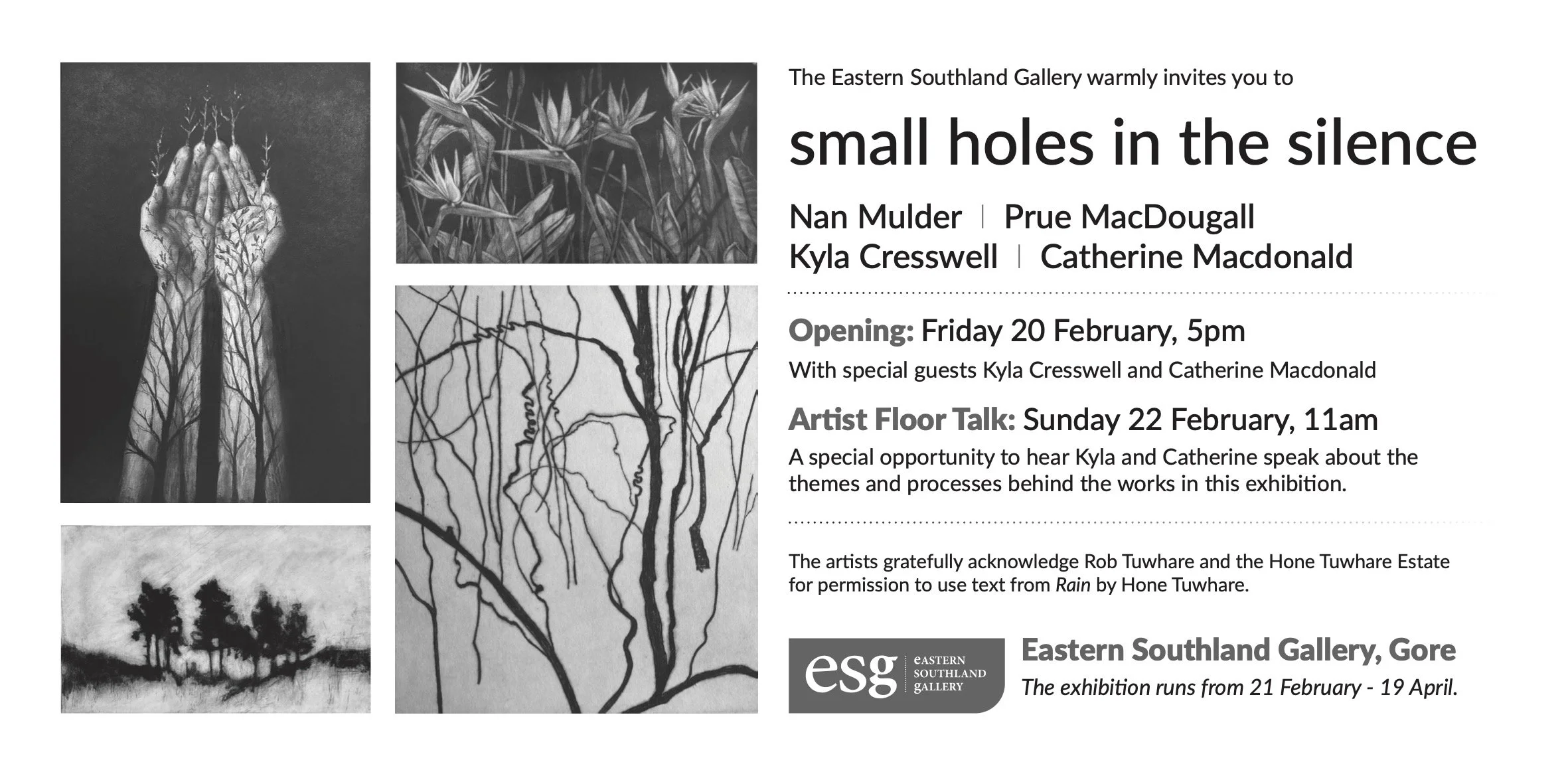 ‘small holes in the silence’ at the Eastern Southland Gallery in Gore - this is the final stop on the South Island tour.